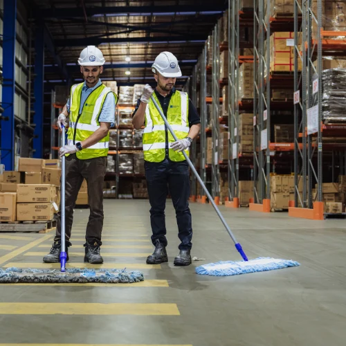 Two warehouse workers wearing safety helmets and yellow reflective vests cleaning the floor with large mops.